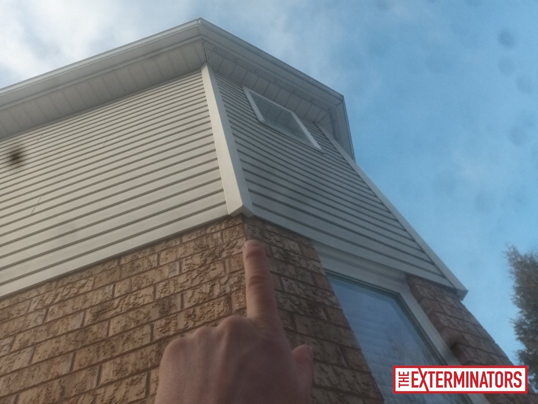 - Photos provided show upper wall and soffit areas where potential gaps may be present at siding and roofline intersections.