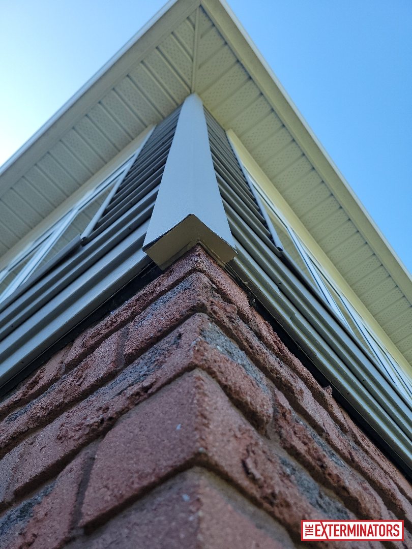 The property is a two-story detached home with brick construction on the lower level and siding above. Multiple transition points between brick, siding, soffit, and deck structures were present, creating potential access routes for rodents.
